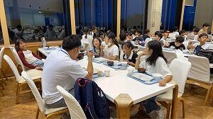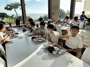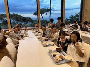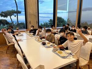 館内オリエンテーリングのあとは、楽しみにしていた夕食です。地下一階なのに海が見えるという不思議なつくりの大食堂でバイキング夕食をいただきました。思い思いのおかずをとって、「いただきます」。動き回った後なので、食欲もりもり。おなかいっぱいいただきました。この後は、どきどきわくわくの「ナイトハイキング」です。