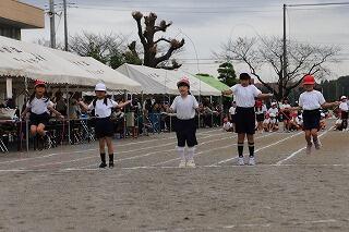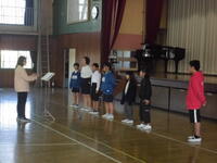 体育館でなわとび大会を行いました。全員で前跳び3分、後ろ跳び1分30秒の持久跳びをやった後、得意な技の技能跳びをやりました。かけ足跳び(前・後)、あや跳び(前・後)、交差跳び(前・後)、二重跳び(前・後)、二重交差跳び、二重あや跳びなど、自分で選んだ2種目を連続何回跳んだか競います。学校や家で頑張って練習した成果を発揮できるように、一生懸命頑張りました。