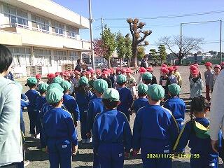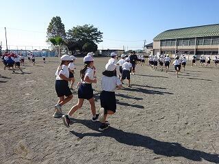 地震が起きた後、家庭科室から火災が発生したという想定で避難訓練を行いました。「おかしもち(押さない 駆けない しゃべらない 戻らない 近づかない)」の合言葉のとおり、真剣に取り組む児童が多く、2分39秒で全員が避難し無事を確認することができました。