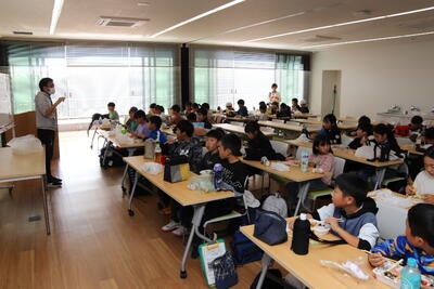 みかも自然の家に到着し、みかも山公園で昼食をとりました。いよいよ自然の家での活動です。入所式の中で、施設の使い方やベッドメイキングの仕方を聞き、これから館内ウォークラリーで館内のことを学びます。