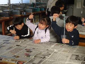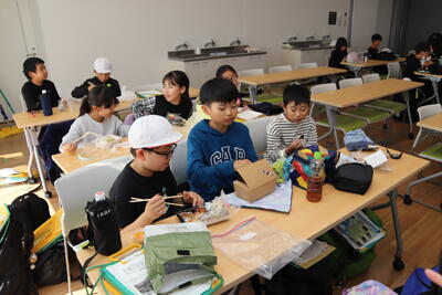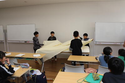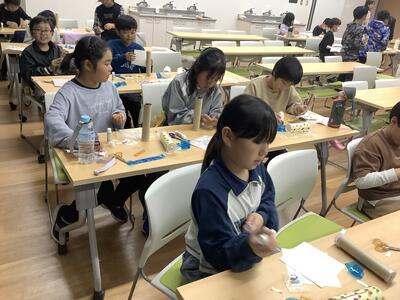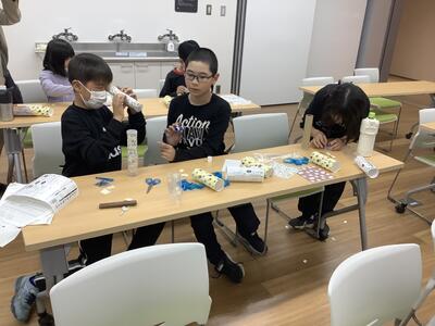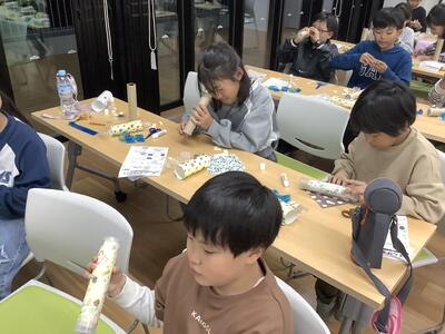 少しゆったりと花の万華鏡づくりです。スターチスの花を入れて綺麗に模様が見えるように工夫しました。グループで協力して教え合いながらよいお土産を作ることができました。