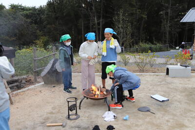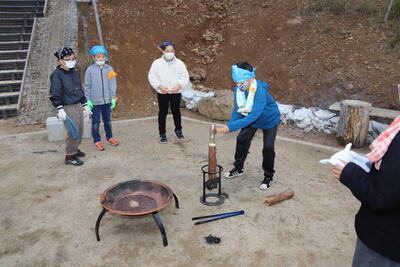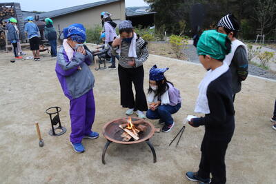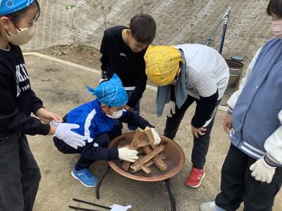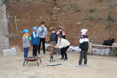 みんながとても楽しみにしていた焚き火サバイバルの時間です。まずは薪を割って、ファイヤースターターで火をつけました。なかなか火がつかず悪戦苦闘でしたが、火がついたときには喜びを爆発させていました。ついた火を使ってマシュマロを焼きました。苦労して焼いたマシュマロの味は格別でしたね。