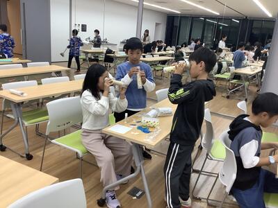 2年生の生活の学習「うごく うごく わたしのおもちゃ」で風やゴムを使ったおもちゃを作った2年生が、1年生のことを招待してくれました。どの遊びも工夫されていて、楽しく遊び、賞品もたくさんもらいました。