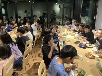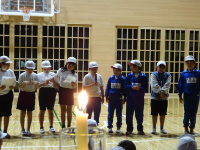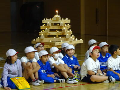 夕食はとても大きな唐揚げがメインの、腕によりをかけたワンプレートメニューです。みんなで楽しく食べました。入浴後はキャンドルファイヤーです。LEDキャンドルライトを各々好きな場所に置き、楽しい夜の集いの始まりです。火の神の話を聞いたり、歌を歌ったり、各クラスの出し物を楽しんだりしました。暗い中での少しいつもと違った雰囲気は、みんなの気持ちを穏やかにしてくれたようです。