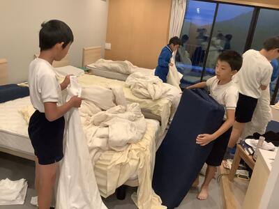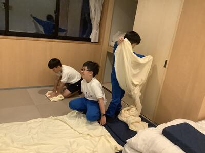 朝はワクワクしていたのか、とても早く起きてしまい、部屋の片づけをしていました。しっかりと部屋の整理整頓を行い、朝食をとりました。パン中心のメニューでしたが、ごはんも食べられます。ごはんもおかわりしている児童もたくさんいました。その後ルームチェックをし、部屋を出ました。