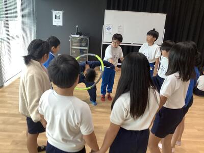 4年生は、講師の方をお招きし、タグラグビーを行いました。タグをとって大きな声で「タグ!」と言うことや、体を様々な方向に動かして自分のタグを守ることなどを学びました。パスの仕方や1対1での突破の練習をしてかなり上達しました。運動量も多く、楽しんで学習することができました。