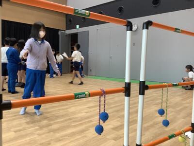昨日の雨により、みかも山の山道がぬかるんでいたため、施設内での活動「チャレンジランキング」に変更しました。たくさんの種目にグループで協力しながら挑戦し、うまくできたときには歓喜の声が上がっていました