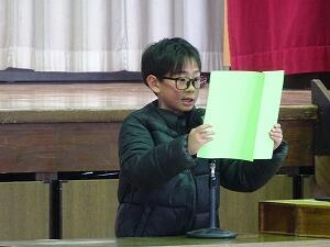 3月24日に修了式が行われました。6年生はすでに卒業しているので、1~5年生が体育館に集まりました。国歌斉唱の後、代表児童による3学期を振り返っての作文発表です。1年間を振り返り来年度頑張りたいことなどを発表してくれました。