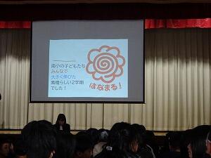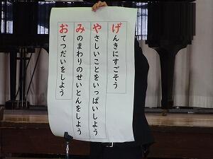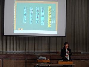 作文発表の後は、校長先生の話です。昨年に引き続き「みんなで伸びる学校」を目指して、3つのがんばってほしいことの話がありました。