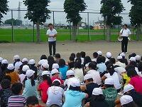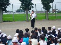 月1回の全校朝会が行われました。校長先生のお話は夏休みの自由研究のすすめがテーマでした。校長先生が沈んだ卵を食塩を入れることにより浮かせる演示実験をしながらお話してくださいました。子どもたちは目を輝かせて卵が浮き上がる様子をみつめました。浮き上がる卵に歓声がわきました。