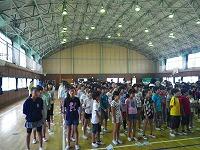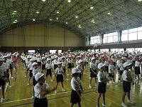 南小では、毎週火曜日と金曜日の南タイムに体力づくりを行っています。今日は雨なので、体育館で夏休みのラジオ体操に向けて練習会を行いました。児童たちは、真剣な態度でラジオ体操の一つ一つの動きを確認していました。