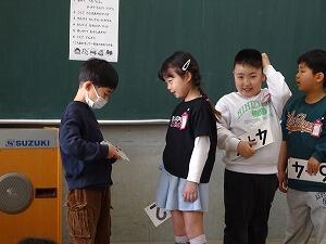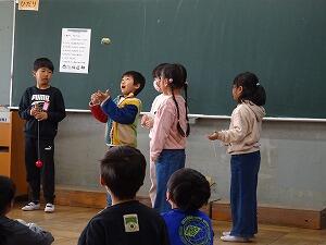 1年生の授業参観は、生活科「もうすぐ2ねんせい」。入学してからの1年間を振り返り、各教科でできるようになったことをおうちの人の前で発表しました。国語 群読、算数 たしざんとひきざん、生活 けん玉・お手玉・あやとり、体育 マット遊び・なわとびなど、今まで勉強(練習)してきたことを、上手に発表しました。
