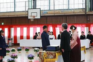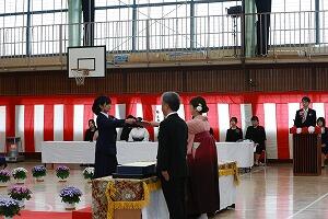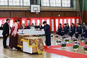 一人一人担任の呼名に合わせて返事をし、校長先生から卒業証書を受け取ります。