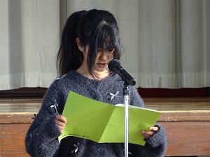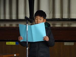 久しぶりに会う子どもたちは、みんな元気そうでした。はじめに、国歌斉唱をし、児童代表作文発表です。1年生と6年生の代表児童が、3学期に頑張りたいことを発表しました。