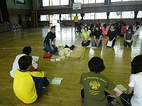 現職教育とPTA教養部主催の会員研修会をタイアップして「心肺蘇生法・AED使用法講習会」を開催しました。栃木市消防署の方を講師としてお招きして、心臓マッサージ・人工呼吸・AEDを組み合わせて行う方法を学びました。練習用の人形とAEDを使い緊急事態を想定した実践的な講習会になりました。