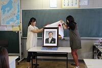第13代南小校長新井義弘前校長先生の掲額式が行われました。教職員、PTAの役員の方、地域の皆様が参加して行われました。除幕の場面では大きな拍手が起こりました。新井前校長先生からお話をいただき、閉式しました。