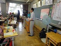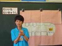 1年生の授業参観時、学校歯科医の石川先生・歯科衛生士さんのご協力のもと、大人の歯列の基準となる大切な第一大臼歯の磨き方を教えていただきました。実施後は、保護者対象の歯の講話を石川先生からいただきました。家庭での食事や歯磨きの指導の大切さをお話しいただきました。