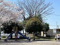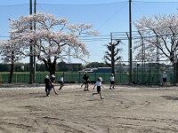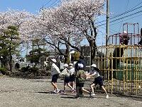 <初めての休み時間:桜の花びら舞い散る中、楽しく遊びました>