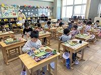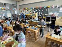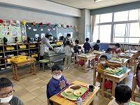 <初めての給食:おいしい給食をみんなでいただきました>