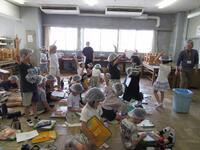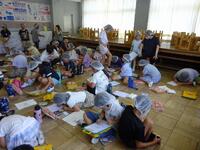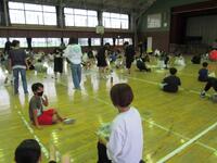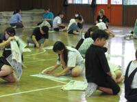 5年生の親子交流活動は、新聞紙を使ったゲームをしました。まずは、親子でじゃんけんをして、負けた方が自分の乗っている新聞紙を半分にしていき、最後まで乗っていることのできた方が勝ちというゲームでした。つま先で立ったり、片足で立ったりと、いろいろ工夫する様子が見られました次は、親子で協力して1枚の新聞紙を切って、なるべく長い1本の紐にするゲームでした。グルグル渦巻のように切ったり、繊維の向きを考えて切ったり、親子でアイディアを出し合いながら笑顔で活動する様子が見られました
