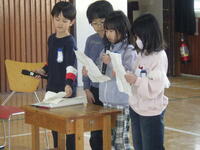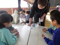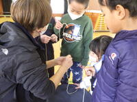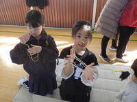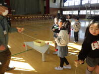 保護者や地域の方々をお招きして、1年生が昔遊び体験を行いました。けん玉、ビー玉、お手玉、竹馬など、昔ながらの遊びのやり方やこつを教えていただきながら、楽しく交流しました。