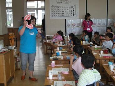 絵や歯の模型を使ってとても分かりやすく、1年生は一生懸命きれいに磨こうとしていました。