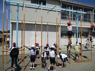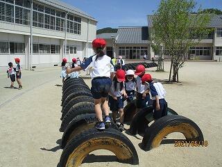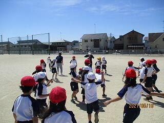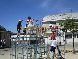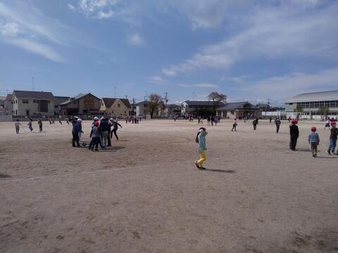 中には、取ったボールを1年生に渡してあげる優しい姿も見られ、お兄さん、お姉さんになったのだと感動しました。また、その後なかよし班に分かれ、それぞれの遊びを行いました。ブランコやジャングルジム、タイヤ、のぼりぼうといった遊具やおにごっこやかくれんぼといった遊びを説明しながら、一緒に遊びました。