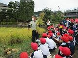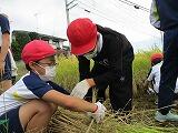 9月25日(月)、絶好の稲刈り日和の中、5年生が稲刈りへ向かいました。6月の田植えから約120日、穂が出てから約40日。富田7環境保全会の皆様がサポートしてくださったお米が立派に実っていました。今日は全て鎌で刈り、15束ずつ束ねて・・・を一生懸命に繰り返しました。「これで、いつも食べている1口分くらいかな。」「昔は鎌もないのにどうしたのだろう。」と、いろいろな声が聞こえてきました。苦労を感じたからか、今日の給食はいつもより多く食べることができたような気がします。
