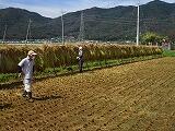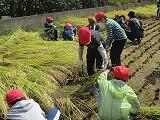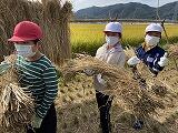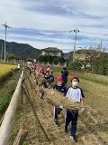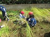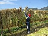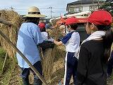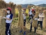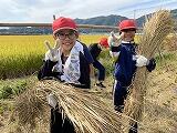 10月3日(火)、5年生が脱穀体験に向かいました。先週、稲刈り体験をして干したものがよく乾きました。今回は機械を使っての作業でしたので、機械への挿入は保全会のみなさまにお願いし、5年生は機械までの運搬作業を頑張りました。作業の途中でこぼれてしまった稲穂を一生懸命に集めるお子さんも多く、これまでの体験や学習を通して、一粒も無駄にしたくない!という思いが強くなったようです。