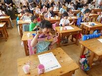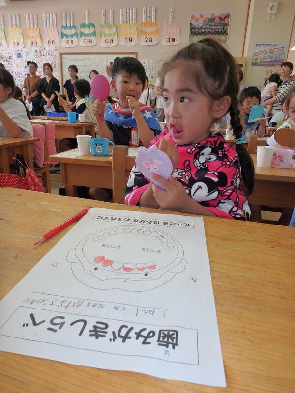 口の中の赤さにびっくりする姿も見られましたが,その後,歯科衛生士さんに正しい歯の