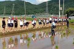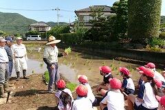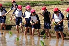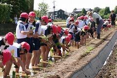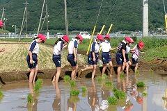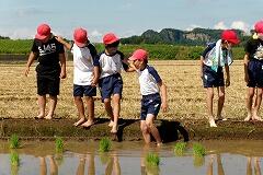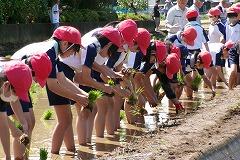 5年生が、総合的な学習の時間『食について考えよう(米づくり)』の学習で、田植え体験にチャレンジしました。
