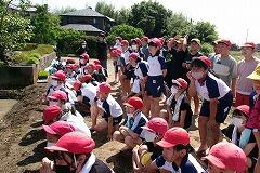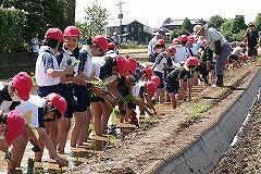 長いロープについている赤い印に合わせて規則正しく苗を植えていきます。さすが5年生