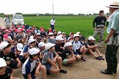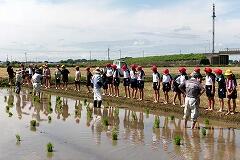 ボランティアの先生から苗の植え方を教えていただき、いざ田んぼに入ります。