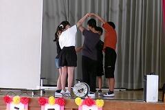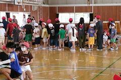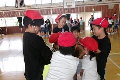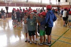 仲良し班のメンバーで手をつないで内側を向いていたものを手を離さず工夫して全員が外側を向けるかチャレンジです。