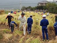 先日刈り取った稲も、天日に干したことで程よく乾燥させることができました。脱穀はコンバインを使って一束ずつ丁寧に機械に入れました。手や服、髪の毛などが機械に巻き込まれないように気を付けながらの作業でした。脱穀された籾を見ると「お~っ!」とか「米だぁ!」など、喜びや驚きの声が上がりました。田んぼに残された落ち穂拾いを丹念に行いながら、お米を作る人の苦労や気持ちを考えることもできました。
