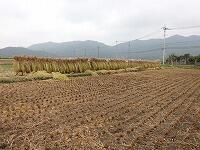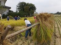 5月に植えた稲も、収穫の時を迎えました。今年は猛暑が過ぎると秋が早かったですが、よく実っているとのこと。野原さん達にご指導をいただきながら、稲刈り鎌を持って一束ずつ刈り取っていきます。15束くらい刈り取ってから、数本のワラで束をしばるのですが、これをきつく締めるのがとても難しく、多くの束はやり直していただくことに…。でも、最後までよく頑張りました。はぜ掛けし、数週間乾燥させます。ずっと残ってほしい日本の光景です。