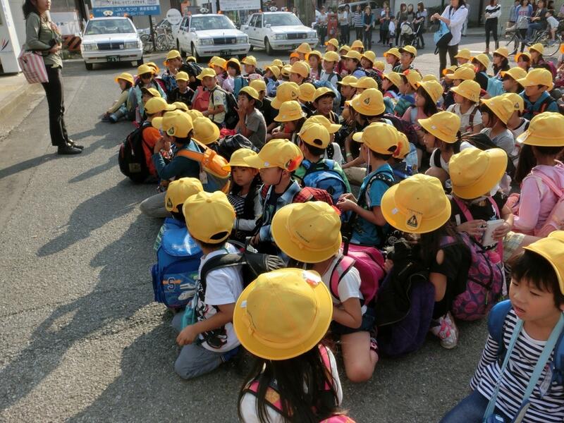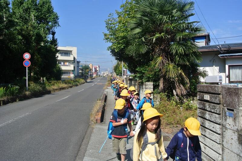 校門を出てすぐから、2年生は道路側を歩いて、手をつないで歩いているペアの1年生に