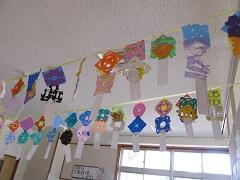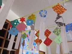 図工「ちょっきんぱでかざろう」の学習で作った折り紙に,願い事を書いた短冊を付けて,