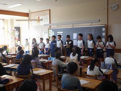 4年生は,6年生を送る会で歌う歌の替え歌づくりをしています。曲は「ありがとうの花」です。みんなで考えた歌詞をつなぎました。先週は,その歌を下級生に教えに行きました。
