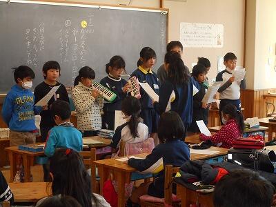 4年生は,6年生を送る会で歌う歌の替え歌づくりをしています。曲は「ありがとうの花」です。みんなで考えた歌詞をつなぎました。先週は,その歌を下級生に教えに行きました。