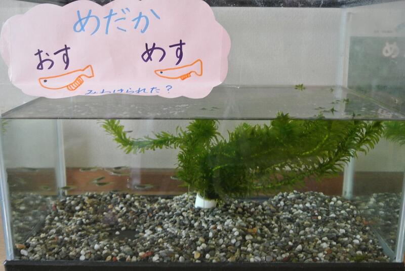 「リーンリーン」「コロコロコロコロ」・・・1年生の教室では虫の鳴き声が響いています。「カタッカタカタ」・・・教材園で捕まえてきたバッタが,虫かごの中でジャンプしている音も聞こえます。休み時間になると,虫かごの周りに集まってみんなで観察します。「えさはどんなものがいいのかな。」「こんな遊び道具があったら楽しそうじゃない?」子どもたちはいろいろなことを話し合っています。それから,先日,1年生が近くの川でメダカを捕まえてきました。水槽で気持ちよく泳いでいる様子を見ながら,メスとオスの見分けにも挑戦しています。