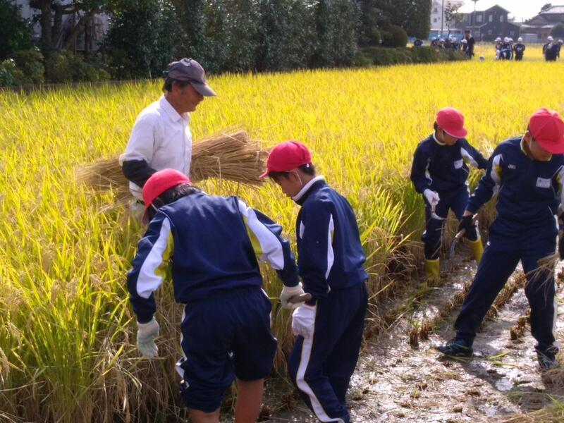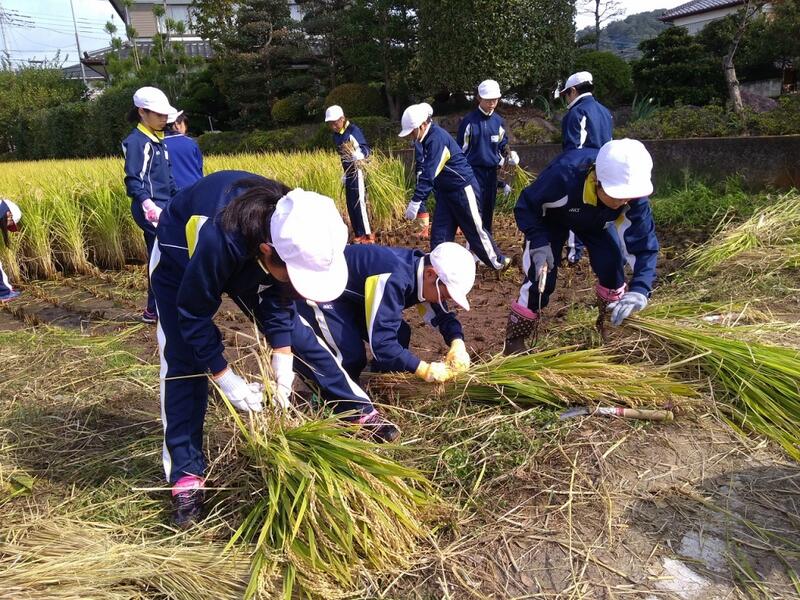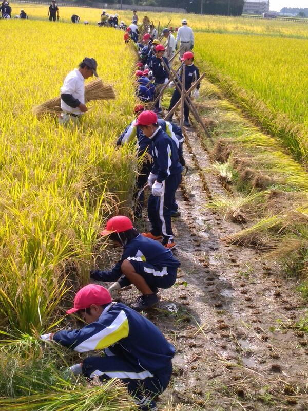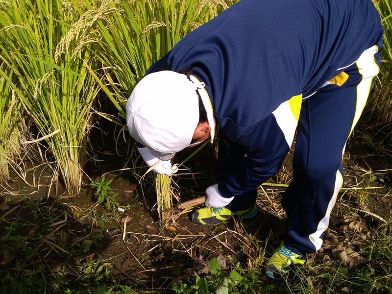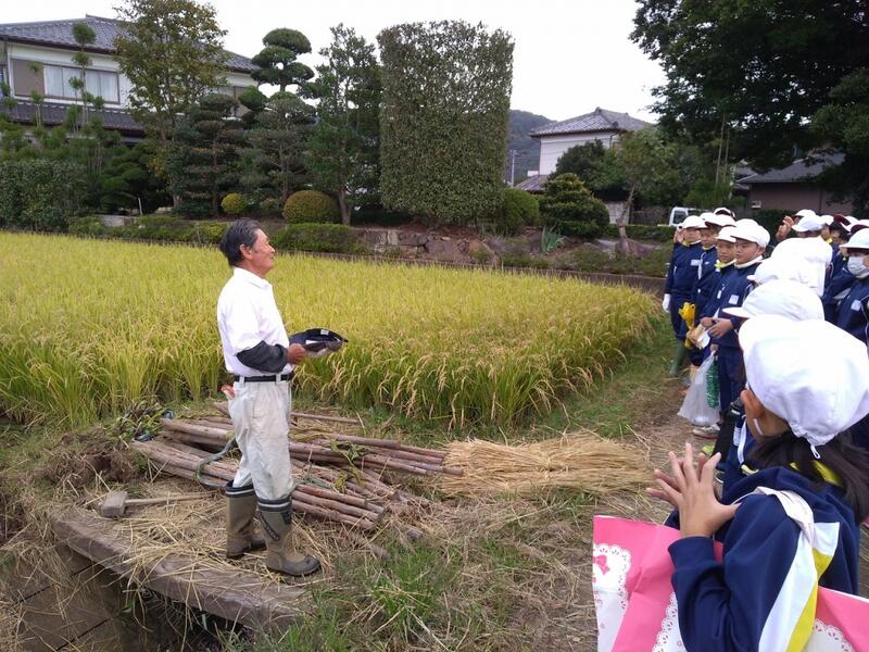 5年の総合的な学習の時間「稲作体験」③として、富7環境保全会の方々のご協力で、稲刈りを行うことができました。台風の影響で、田はぬかるんだ状態でしたが、稲は倒れることなく無事に生長しました。稲刈り用の鎌で稲を刈り、刈ったものは15株ずつまとめてわらで縛ります。環境保全会の方のように、堅く結ぶことが難しく、何度もやり直しをしていました。約1時間の体験活動でしたが、子どもたちはだいぶ疲れた様子でした。稲を干した後、次は脱穀をします。