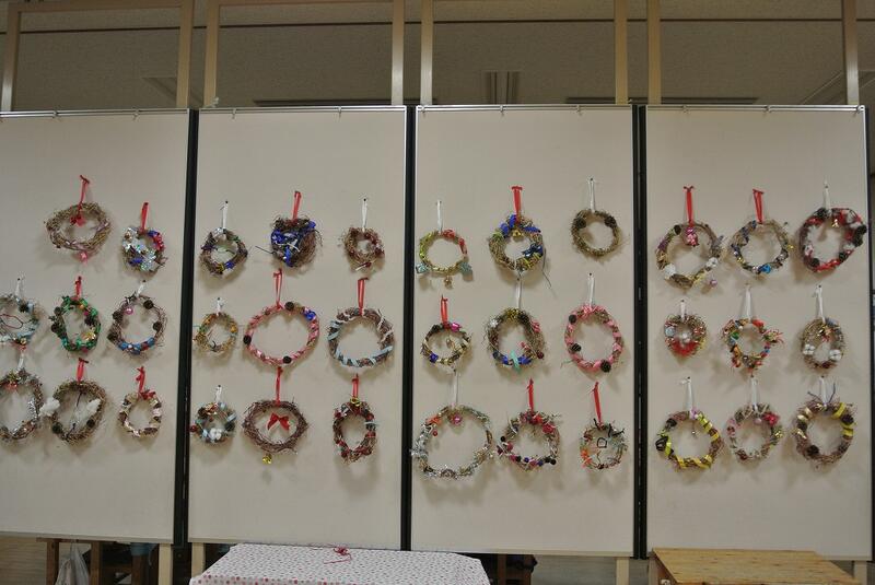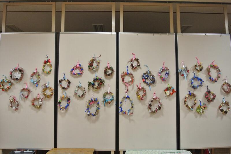 十分に乾燥させた朝顔のつるに,松ぼっくりやリボンなどで丁寧に飾り付けをしました。世界に1つだけのすてきなリースが完成しました。