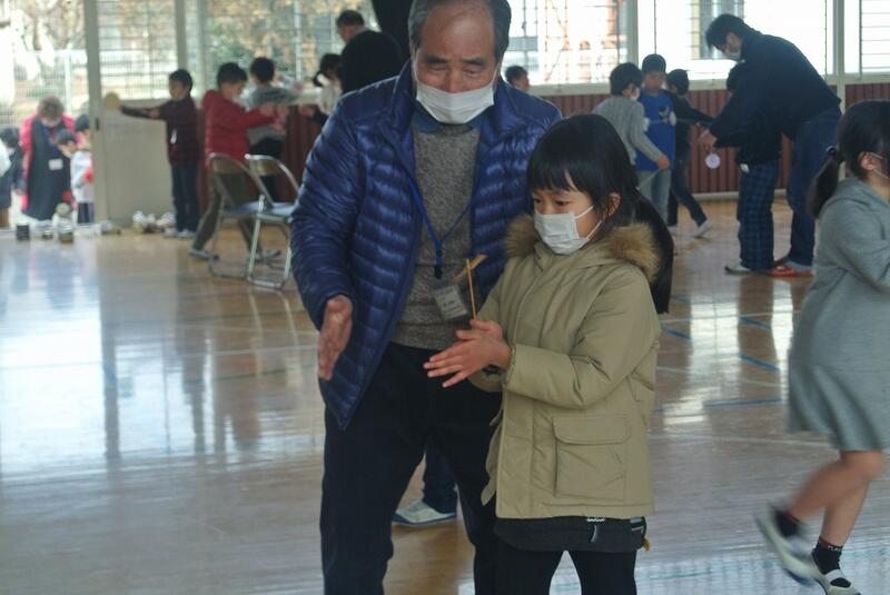 2月8日(金)に,1年生の祖父母の皆様と歴代PTA会長さん,そして手話の先生方から昔の遊びを教えていただきました。子どもたちは,あやとり・おはじきとビー玉・けん玉・こま・お手玉・竹とんぼ・空き缶ぽっくり・ぶんぶんごまの遊びの中から2つの遊びを選びました。そして,遊び方や遊びのこつを丁寧に教えていただきました。子どもたちは,教えていただくとすぐにその遊びに熱中し,上手に出来ると,とても喜んでいました。