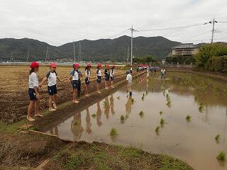 6月11日(火)、野原さんをはじめとする富七環境保全会のみなさまに協力いただき、田植え体験を行いました。裸足で田んぼに入り、一つずつ丁寧に苗を植えました。「農家の人たちはすごい。」という声や「お米を作りは大変だ。」という声が聞こえました。米作りの大変さを感じながらも達成感を感じている様子でした。
