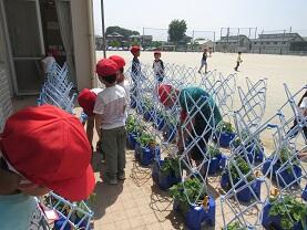あさがおが大きくなってきたので、支柱をたてて、追肥をしました。