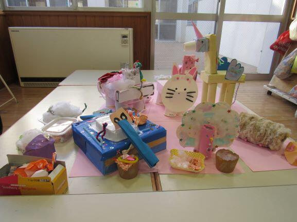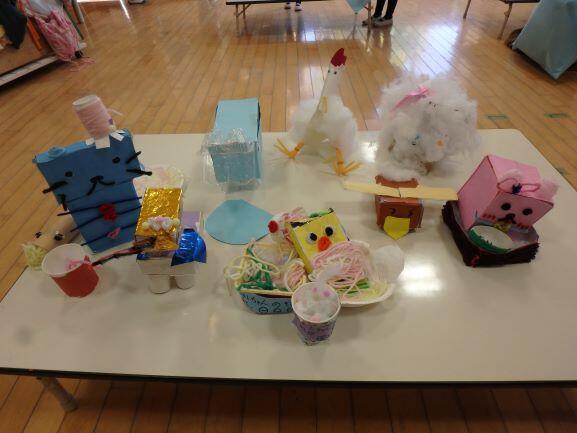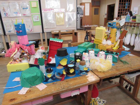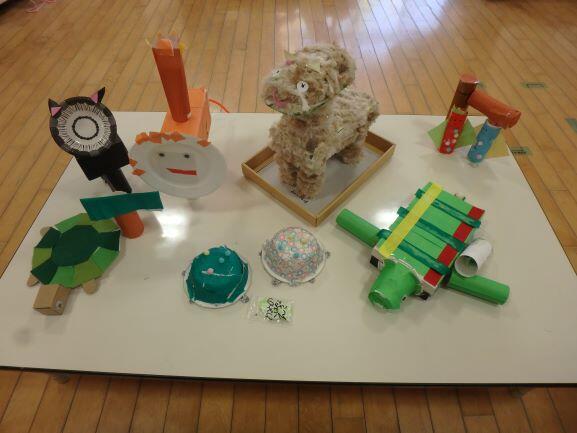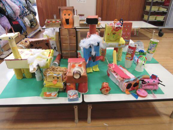 図工で「どうぶつむらのピクニック」を作りました。ワニやうさぎ、ぞう、ライオン、にわとり、へびなどなど、いろいろな動物ができあがり、教室が素敵な動物村になりました。