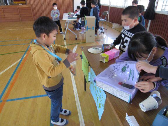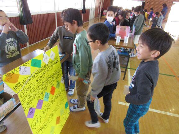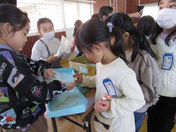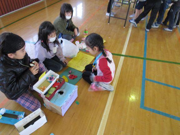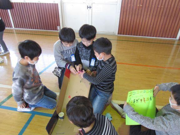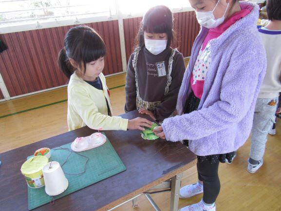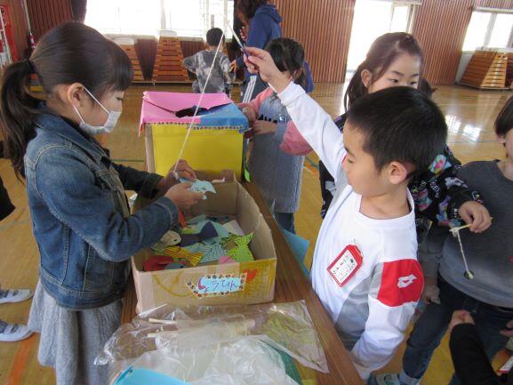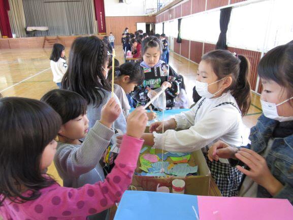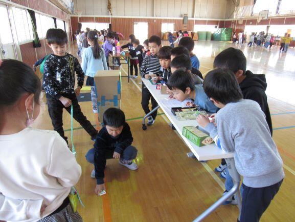 11月29日(月)の3時間目に、2年生のおもちゃランドに招待されました。体育館で、2年生が作った「動くおもちゃ」で遊ばせてもらったり、プレゼントの折り紙をもらったりして、ニコニコ笑顔の1時間を過ごしました。