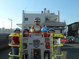 栃木消防署では,消防署の仕事について消防士さんからお話を聞いたり,緊急車両を実際に見せていただいたりし,子どもたちは終始目を輝かせていました。また,全員はしご車に乗せてもらい,とても貴重な体験をすることができました。