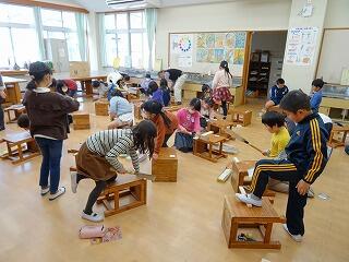 2月3・4日に,図工の学習でのこぎりボランティアの天海さんが来校し,のこぎりの使い方を丁寧に教えてくださいました。のこぎりの使い方のこつを丁寧に教えてくださったり,一緒に手をとって木を切ってくださったりしました。三角形や四角形だけではなく,六角形などの形の切り方も教えてくださり,子どもたちはとても喜んでいました。集中して,一生懸命に取り組み,何よりも安全に学習を進めることができました。のこぎりボランティアの天海さん,本当にありがとうございました。